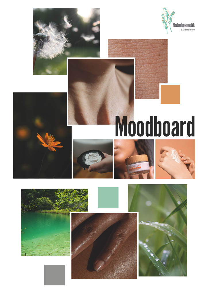 Zum Auftrag soll ein Moodboard basierend auf dem CI/CD erstellt werden, dass bei der Produktion des Videos als Orientierung dienen soll. Da das Thema Naturkosmetik ist, wollten wir möglichst natürliche Farben verwenden und Bilder aus der Natur verwenden.